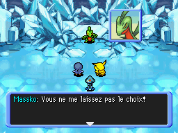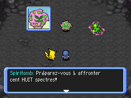 Au bout, vous apercevez Massko, mis à terre par un mystérieux Pokémon qui se révèle être un Spiritomb. Il vous attaque alors. Ce Pokémon est très endurant, et sa capacité Pression diminuera rapidement vos PPs, donc essayez de finir rapidement le combat.