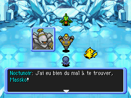 Tout au bout, vous tombez sur Crefadet et Massko. Le gardien du Rouage a utilisé les cristaux pour bloquer l'accès au lac. Vous arrivez sur ces entre-faits et sauvez Crefadet de l'attaque de Massko qui s'en prend à vous. C'est un adversaire plutôt coriace, il vous faudra donc le ralentir ou l'empêcher d'attaquer, en particulier si vous n'avez pas de Pokémon Feu dans votre équipe d'exploration.
