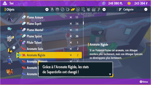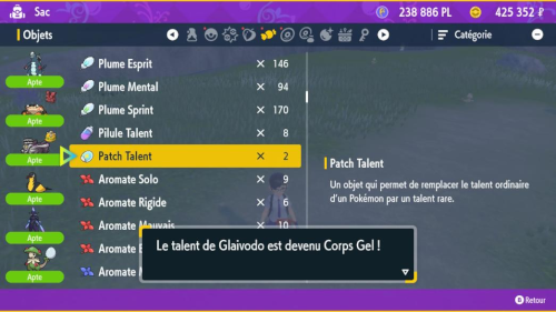 Note : contrairement aux Capsules et aux Aromates, la Pilule Talent et le Patch Talent modifient réellement le talent du Pokémon : il transmettra son nouveau talent à la reproduction.
