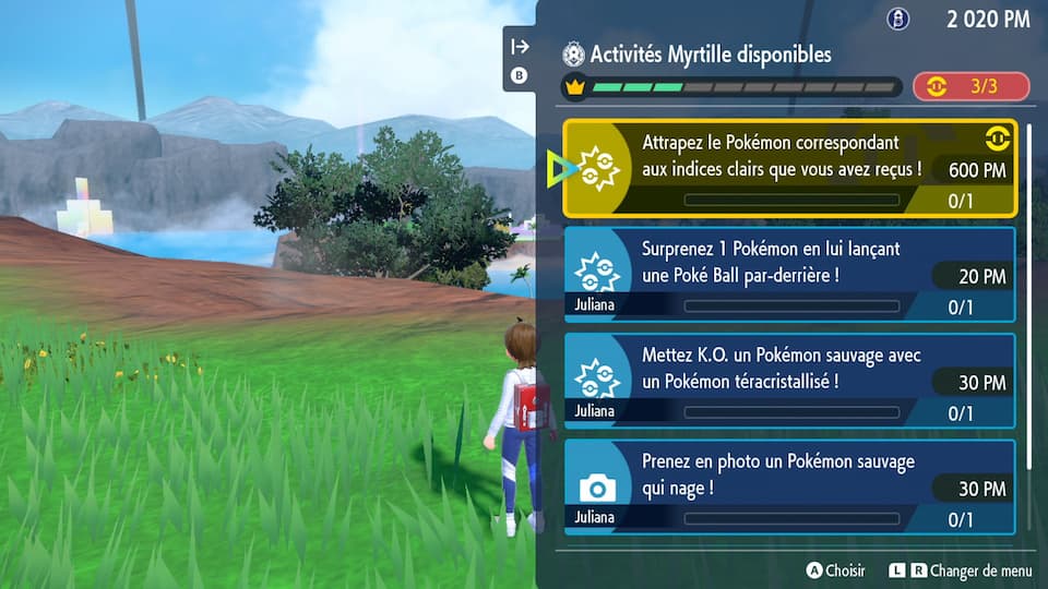 Les Activités Myrtille sont très variées. Certaines vous demandent de combattre les Pokémon d'une certaine manière, d'autres de prendre en photo des espèces particulières. Vous pouvez consulter vos activités Myrtille en appuyant sur la flèche droite de votre croix directionnelle.