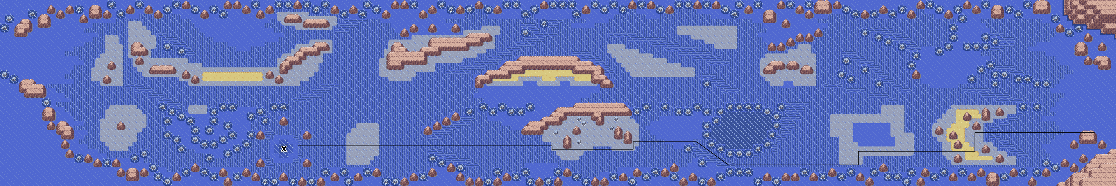 Allez à Pacifiville, et partez vers l'ouest (en direction de Poivressel). Il faut vous frayer un chemin à travers les courants et les rochers qui ponctuent le parcours, suivez le chemin indiqué sur la carte :