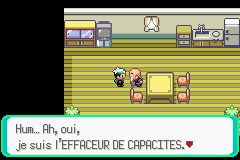 Cet homme vit à Nénucrique, dans la maison juste à droite du Centre Commercial. Il permet d'effacer n'importe quelle attaque de vos Pokémon, tout ceci gratuitement. Utile pour supprimer une CS que vous jugez inutile sur un de vos Pokémon.