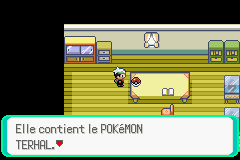 Pour obtenir ce Pokémon, vous devez avoir battu la Ligue auparavant. Rendez-vous ensuite chez Pierre Rochard à Algatia. Une Poké Ball est alors posée sur la table. Ramassez-la, elle contient le Pokémon Boulefer Terhal.Là-encore, ce Pokémon n'est trouvable nulle part ailleurs, alors gardez-le bien précieusement.