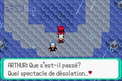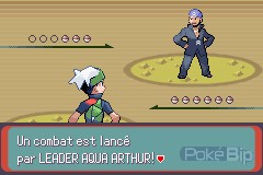 Dans la dernière salle, nous tombons nez-à-nez avec Kyogre, le Pokémon légendaire marin. En nous plaçant en face de lui, Arthur débarque et nous provoque en duel.