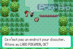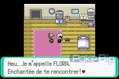 Au rez-de-chaussée, la femme du professeur nous apprend que sa fille (son fils) souhaite nous rencontrer. On grimpe donc à l'étage. Malheureusement, il n'y a personne dans la pièce et la seule chose qui puisse attirer notre attention est une Pokéball placée au milieu de la pièce. En cliquant sur le dit-objet, Flora (ou Brice) arrive et commence à s'adresser à nous. Après une brève présentation de sa part, nous pouvons enfin quitter la pièce.