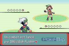 C'est parti pour notre tout premier combat contre un Dresseur. Flora possède le starter ayant le type avantagé par rapport au notre. Le combat n'est pas trop dur en soi. Vous pouvez toujours user des Potions qui vous ont été remises juste avant.