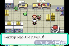 De retour à Bourg-en-Vol, nous nous dirigeons vers le Laboratoire. À l'intérieur, le Prof.Seko, en compagnie de notre rival(e), nous félicite de notre victoire (dans l'hypothèse qu'on ait gagné) et nous remet le très précieux Pokédex. Il s'agit d'un outil qui recense tous les Pokémon rencontrés (et capturés) jusque là.