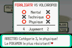 Le Pokémon qui s'est montré le plus offensif (qui a lancé le plus d'attaques infligeant des dégâts) gagne ce critère.2ème critère : la technique