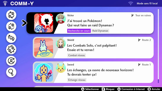Stickers : sert d'historique des actions effectuées. Cela comprend toutes les activités en local ou en ligne comme une recherche d'échange, de combat ou de participants pour un raid Dynamax (il s'agit du seul endroit permettant de participer à un raid Dynamax !) mais cela comprend aussi certaines actions clés comme une capture d'un Pokémon rare, une évolution d'un Pokémon ou la cuisine d'un Curry. Les stickers se mettent à jour automatiquement, vous pouvez choisir d'afficher les nouveaux stickers en appuyant sur X. Vous pouvez filtrer les stickers selon les activités que vous recherchez.