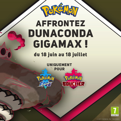 Ceux qui se sont connectés (ou inscrits) sur le site officiel de Micromania en France et d'autres enseignes dans les divers pays participants ont pu obtenir un bonus exclusif sous la forme d'un code (un par jeu, distribués du 18 juin au 18 juillet 2021 puis valides jusqu'au 31 octobre 2021) qui permettait aux joueurs d'obtenir le Cristal Géant appelé ★Sgr7348. En l'utilisant dans la Tour en ruines des Terres Sauvages, il était possible d'affronter et d'attraper Dunaconda Gigamax lors de raids Dynamax spéciaux. Voici ses caractéristiques (sa nature était bien évidemment aléatoire) :