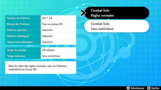 | Règles | Règles normales | Sans restrictions | Règles de la Tour de Combat |