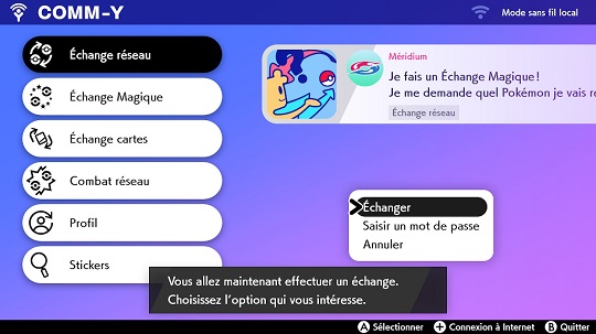 Lorsque le jeu a trouvé un partenaire d'échange, votre menu Comm-Y en bas à gauche vous le notifie : appuyez sur Y pour récupérer le Pokémon provenant de l'échange.