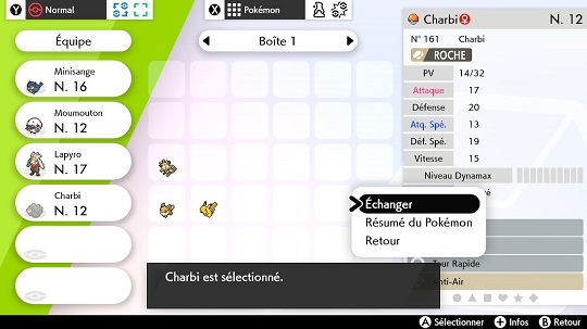 Note : Vous ne pouvez pas sélectionner un Pokémon de votre équipe. Le Pokémon sélectionné sera bloqué : il ne pourra pas être déplacé, marqué, relâché et son objet tenu ne peut plus être changé, jusqu'à que l'échange ait lieu ou soit annulé.