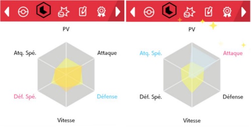 Comme dans Soleil et Lune, il est possible de vérifier dans quelles statistiques vos EV sont répartis. Pour cela, rendez-vous dans le résumé de votre Pokémon, puis dans la partie « statistiques » (deuxième en partant de la gauche), puis appuyez sur X. Vous verrez un graphique de couleur jaune foncé qui indique vos EV. Lorsque vous avez réparti vos 510 EV, il devient bleu. Si vous avez maximisé une statistique, vous verrez des étoiles briller à côté de son nom.