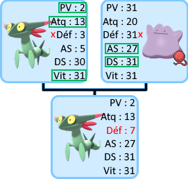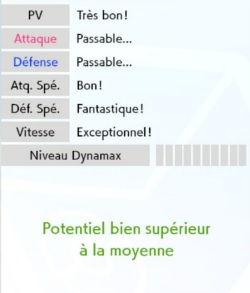Statistique Valeur de l'IV Pas top 0 Passable 1 à 15 Bon 16 à 25 Très bon 26 à 29 Fantastique 30 Exceptionnel 31 Remarque globale Valeur totale des IV Potentiel correct 0 à 90 Potentiel supérieur à la moyenne 91 à 120 Potentiel bien supérieur à la moyenne 121 à 150 Potentiel exceptionnel 151 à 186