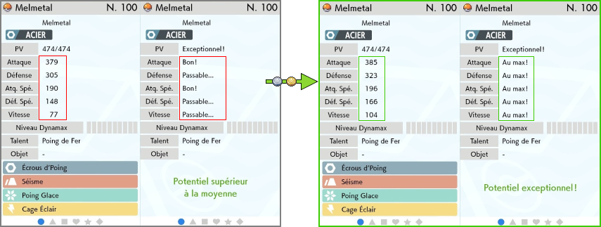 Les statistiques sont augmentées de manière "artificielle" : durant n'importe quel combat, cela agira comme si votre Pokémon avait son ou ses IV à 31. Mais les IV de base du Pokémon sont conservés et ce sont ces IV de base qui sont transmis durant la reproduction par exemple.