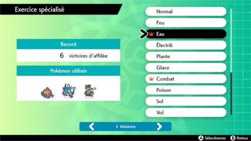 Le but de l'exercice spécialisé est de réaliser la plus haute série de victoires consécutives. Les exercices sont séparés par type, vous devez avoir exactement 3 Pokémon dans votre équipe partageant un type en commun pour participer à l'exercice correspondant (le Pokémon en tête d'équipe sera obligatoirement envoyé en premier). Vos adversaires ne sont pas soumis à la restriction sur les types !Contrairement aux structures de combat standards, vos PV, PP, problèmes de statut et objets consommables qui sont consommés/perdus ne sont pas régénérés entre chaque combat. Vous avez cependant droit à 2 soins par série. Il n'est pas possible de suspendre une série en cours pour la reprendre plus tard. Vous ne pouvez que continuer ou abandonner.