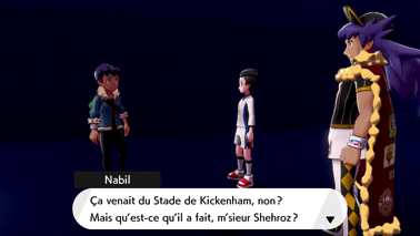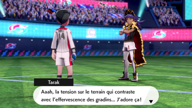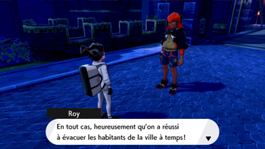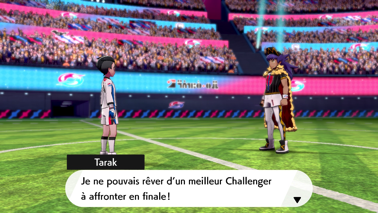 Dès votre arrivée, vous êtes accueilli par Roy. Alors que Nabil se précipite dans le stade pour prêter main-forte à son frère, le Champion de la ville qui vous informe que les habitants de la ville ont été évacués, mais sont sains et saufs. grâce aux différents Champions. Sachant que Tarak sera aidé de son frère et vous qui êtes très talentueux, Roy ne se fait pas de souci sur votre capacité à venir à bout du mal qui s'abat sur Galar !