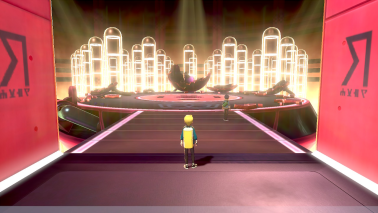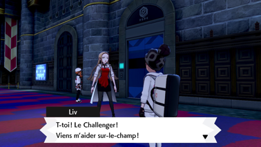 Dans le hall, Liv fait les cent pas et quand elle vous voit, elle implore votre aide car ses Pokémon se sont retrouvés dynamaxés dans le stade. Elle redoute que celui-ci ne s'effondre sous leur poids, et tenter d'envoyer d'autres Pokémon géants pour les calmer ne ferait qu'aggraver la situation. Vous acceptez sa demande de vous rendre dans la salle du réacteur qui risque d'être ensevelie pour sauver le président de sa folie ! Elle vous informe aussi qu'il a réveillé un Pokémon nommé Éthernatos, et c'est lui qui est à l'origine de l'énergie qui permet aux Pokémon de devenir géants !