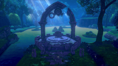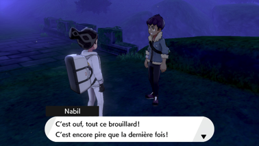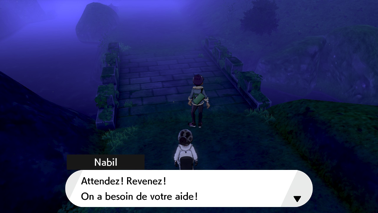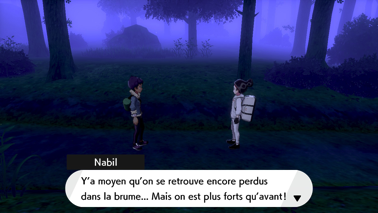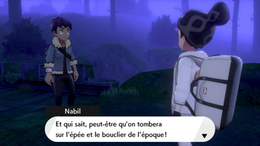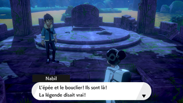 Vous arrivez alors dans un endroit mystérieux où la brume est étrangement dissipée. Il s'agit d'un ancien sanctuaire ! Nabil remarque l'épée et le bouclier de la légende. Vous vous emparez de l'Épée Rouillée (sur Pokémon Épée) ou du Bouclier Rouillé (sur Pokémon Bouclier), tandis que votre ami ramasse l'artefact restant !
