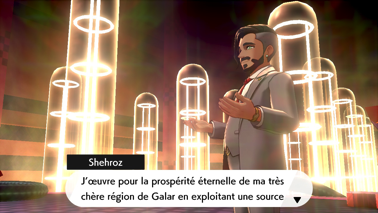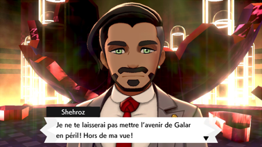 Malgré sa défaite, il se met à sourire, ayant retrouvé le plaisir des combats de Pokémon. Il reconnaît votre force et regrette d'avoir dû interrompre le match contre Tarak, mais son projet était bien plus important à ses yeux. Il admet cependant qu'il n'a pas su garder la situation sous contrôle et vous explique que le Maître est venu à son aide pour réparer son erreur. À cet instant, Shehroz pense que Tarak a dû capturer Éthernatos pour l'empêcher de nuire, et vous invite à prendre l'ascenseur pour vérifier.