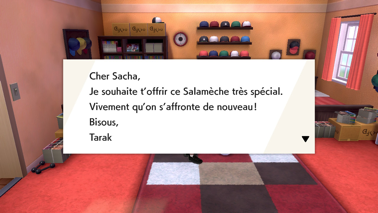 En vous rendant dans la maison de Nabil et Tarak à Paddoxton, montez à l'étage dans la chambre de Tarak pour trouver une Poké Ball contenant un Salamèche accompagnée d'une lettre vous informant que Tarak vous l'offre ! Il a la particularité de pouvoir Gigamaxer une fois évolué en Dracaufeu !