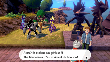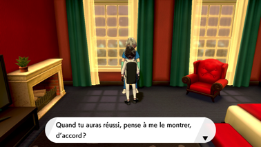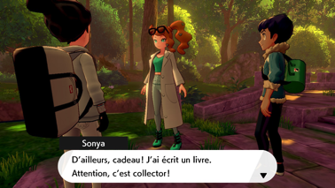 Même s'il espérait avoir une chance, Nabil n'est pas vraiment surpris de votre victoire, sachant que vous aviez déjà vaincu son frère. C'est alors que Sonya vous rejoint en rouspétant à cause du bruit que vous faîtes tous les deux. Mais elle ne semble pas réellement énervée puisqu'elle vous félicite à son tour pour être devenu Maître de Galar ! En tant que nouvelle Professeure, elle a terminé et publié sa thèse de doctorat avec le soutien de sa grand-mère. Elle a même écrit son propre livre, et vous en offre un exemplaire dédicacé ! Celui-ci retrace l'histoire de ses recherches et ses découvertes effectuées tout au long de l'aventure réalisée a vos côtés ! Nabil s'exclame alors qu'il en a déjà acheté un et qu'il vous admire énormément pour vos accomplissements, à Sonya et vous-même.