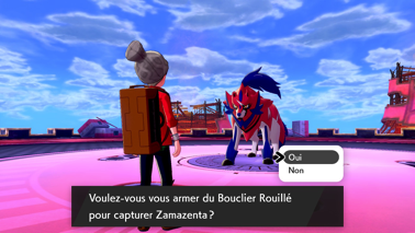 Sauvegardez à ce moment-là, car voilà enfin le moment de capturer le Pokémon légendaire emblématique de votre jeu ! Vous avez encore la possibilité de retourner au Centre Pokémon pour vous soigner, si nécessaire. Lorsque vous êtes prêt, approchez-vous de ce valeureux Pokémon, et armez-vous de l'Épée Rouillée (Épée) ou du Bouclier Rouillé (Bouclier). Le légendaire va alors prendre sa forme Suprême, devenant plus puissant que son prédécesseur.