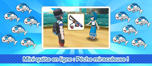 ![]() Pêche Miraculeuse | Du 30/06/17 au 13/05/17 | Pêcher 250 000 Pokémon ou objets (500 000 selon les jeux et le PGL japonais) | Succès : 2000 Festipièces Échec : 200 Festipièces | Succès : 4000 Festipièces Échec : 400 Festipièces Score individuel ≥ 3 : 5 Super Bonbons Score total ≥ 500 000 : 1 Niveau Ball | Succès (1 228 170) |
