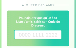 Chaque Dresseur possède un Code unique, composé de 12 caractères. Grâce à lui, vous pouvez ajouter d'autres Dresseurs en tant qu'amis. Pour y accéder, allez sur votre profil de Dresseur et touchez l'onglet "Amis". Touchez ensuite le bouton "Ajouter des amis" pour voir votre Code. Les autres Dresseurs doivent entrer votre code sur leurs appareils pour pouvoir vous envoyer une Invitation. Pour changer votre Code, appuyez sur l'icône Rafraîchir et il sera réinitialisé.