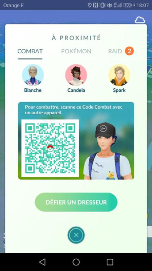 - Pour commencer un combat, mettez-vous à proximité du dresseur à combattre (sauf si vous souhaitez vous battre avec un Excellent ou Meilleur ami). Accédez ensuite à votre Code Combat en passant par "À proximité" sur l'écran et en touchant l'onglet Combat. Votre code est ainsi visible et le dresseur doit le scanner pour qu'un Défi de Combat vous soit envoyé. Touchez donc "Défier un Dresseur" pour pouvoir scanner son code.