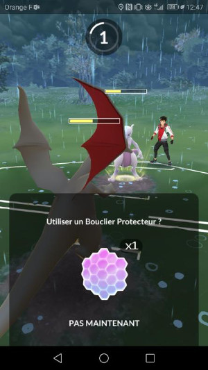 Lorsque votre adversaire lance une Attaque Chargée, vous aurez la possibilité de vous défendre avec un Bouclier Protecteur. Si vous choisissez de vous défendre pendant ce tour pour atténuer le coup d'une attaque imminente, touchez l'écran pendant cette séquence pour consolider votre Pokémon et utiliser ledit bouclier. Vous aurez besoin de stratégies judicieuses puisque vous ne disposez que d'un nombre limité de boucliers par combat.