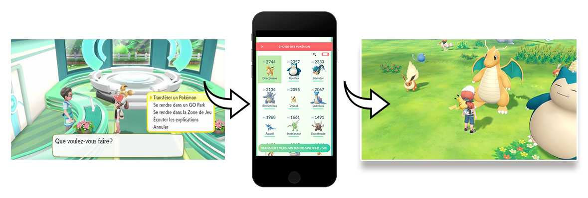 Pokémon : Let's Go, Pikachu et Pokémon : Let's Go, Évoli peuvent très simplement être connectés à Pokémon GO via la technologie Bluetooth. Une fois la connexion établie, toutes les instructions s'affichent à l'écran.