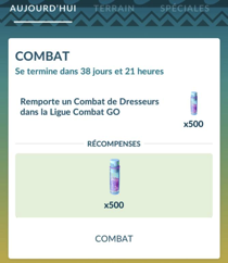| 3 | Gagner un Combat en Raid Faire 1 Excellent lancer Capturer 7 Pokémon de | CT Attaque Immédiate (x1)1000 PX Super Balls (x5) | Poussières Étoiles (x1000)Rencontre avec Baie Nanana Argentée (x1) |