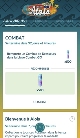 | 1 | Remporter 1 Combat de Dresseurs en Ligue de Combat GO | Poussières Étoiles (x500) | Poussières Étoiles (x500) |
