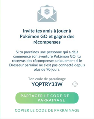 Depuis le 31 mars 2021, un programme de parrainage est désormais disponible dans le monde entier sur le jeu de Niantic ! Si vous incitez quelqu'un à jouer au jeu pour la première fois ou à y rejouer après avoir été inactif, il recevra tout comme vous, de nombreuses récompenses (rencontres de Pokémon, Super Bonbons, Incubateurs...).