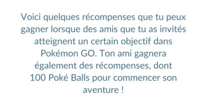 Une fois le code rentré, vous commencerez à recevoir les récompenses (dont 100 Poké Balls si vous commencez votre aventure) ! Plus vous avancez et complétez les étapes, plus vous recevrez des récompenses (dont de la Méga-Énergie ou encore des Super Bonbons et même des Stickers uniques). Toutes les complétions d'étapes et récompenses sont visibles sur votre fiche et celles des dresseurs parrainés.