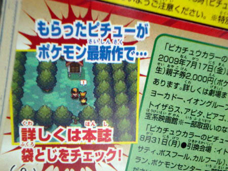 Le neuvième scan est un zoom du 6eme, qui nous confirme que le héros est avec les deux Pichu devant l'autel de Celebi. Sur la droite est écrit que la campagné de réservation du jeu commencerait dès le 17 Juillet. La suite du texte nous parle de la distribution du Pichu-coloured, qui a lieu jusqu'au 31 Août.