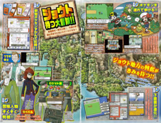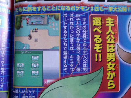 Sur ce scan, on peut voir les nouveaux artworks de Kaiminus et du héros. On peut également constater que le choix du starter se fera sur une sorte de platau tournant ( certainement avec l'écran tactile, qui sait ? ). On remarque à nouveau le Pokématos, ce coup-ci sur le poignet du héros, ainsi que plusieurs screens montrant divers batîments importants du jeu.