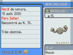 ** Route 33 : Bien que le Guide Officiel dise que les Pokémon de type Eau, Feu, Sol et Roche ne peuvent pas trouver de Feuille d'Or, cela reste bel et bien possible !
