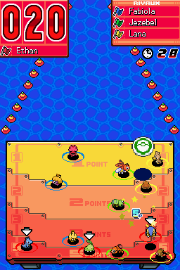 Si un Pokémon reste dans un cercle à la fin du imparti, il marque des points : Les cercles jaunes (très grands) donnent 1 point, les cercles bleus (grands) 2 points, les cercles violets (moyens) 3 points et les cercles rouges (petits) 5 points.