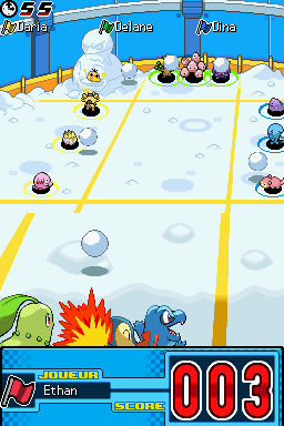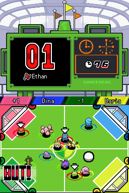 Cette épreuve consiste à tirer dans un ballon pour marquer des buts dans la cage des adversaires, il s'agit d'un football à 4. Faites glisser le stylet pour déplacer vos Pokémon et dribbler. Glissez deux fois pour tirer dans le ballon.