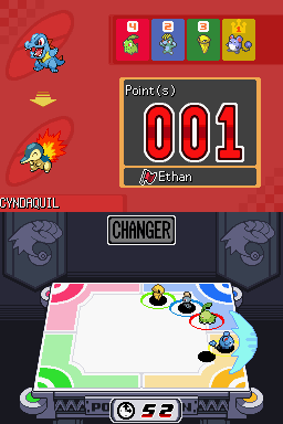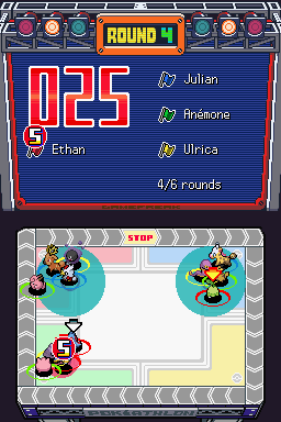 Cette épreuve consiste à occuper des cercles avec vos 3 Pokémon en ne laissant pas vos adversaires le faire, à la manière des chaises musicales. Faites glisser le stylet pour déplacer vos Pokémon et pousser vos adversaires.