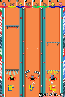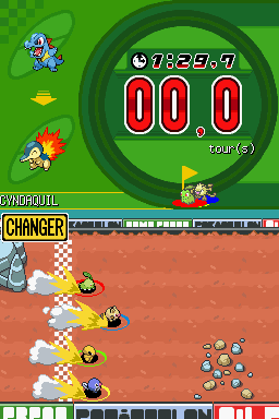 Cette épreuve consiste à faire une course de relais contre vos adversaires sur un terrain avec des obstacles. Faites glisser votre stylet vers la droite pour faire courir vos Pokémon et esquiver les obstacles.