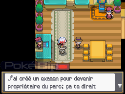 Lorsque nous arrivons dans le hall, M. Baoba nous propose le test pour devenir propriétaire du parc (figure 92). La première épreuve consiste à capturer un Racaillou et à le lui montrer. Pour cela, n'oublions pas de libérer de la place dans notre équipe afin d'avoir le Racaillou sur nous dès notre sortie du Parc.