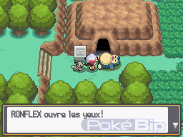 Nous voici à présent devant le Ronflex qui bouche, par sa taille imposante, l'entrée de la Cave Taupiqueur. Sauvegardons bien avant de tenter de le réveiller et de le capturer, car c'est le seul Ronflex sauvage du jeu, et assurons-nous d'avoir un Pokémon avec Coupe.Ensuite, ouvrons le Pokématos à la page Radio et jouons la station Pokéflûte (il faut utiliser le curseur pour déplacer les réglages vers le point le plus en haut). Au son de la Pokéflûte, Ronflex se réveille (figure 167).
