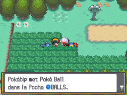 Alors que nous quittons Bourg Géon pour ne pas y revenir avant longtemps (et huit badges, je spoile un peu), notre BFF nous attend pour nous apprendre comment capturer les Pokémon sauvages (figure 37). Suivons bien ses conseils pour nous en souvenir plus tard. BFF nous donne également des Poké Ball pour capturer des Pokémon sauvages (figure 38). C'est le moment ou jamais d'essayer !