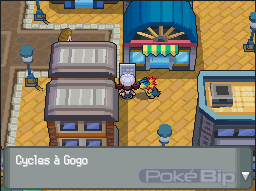 Au Casino, exit les machines à sous. M. Jeu nous donne une Boîte Jetons et nous fait jouer à la Voltorbataille (une sorte de Démineur). Puis, faisons un tour au Cycles à gogo (figure 74), caché dans une ruelle. Le patron nous prête une Bicyclette pour lui faire de la pub ! Nous allons pouvoir nous déplacer plus rapidement désormais.
