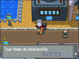 Doublonville a également une Tour Radio (figure 75). Si nous parlons à l'hôtesse de droite, elle nous propose un questionnaire. Répondons par « oui, oui, non, oui, non » et nous recevons un Coupon Radio. Une fois glissé dans notre Pokématos, ce dernier nous permet désormais d'écouter de fantastiques émissions passionnantes, ainsi que de la musique. Nous pouvons aussi, au rez-de-chaussée, participer à la Loterie Pokémon. Le premier étage ensuite, est le studio de Buena. Elle nous donne une Carte Bleue. Son émission est « le Mot de Passe de Buena ». Si nous nous souvenons du Mot de Passe et que nous revenons lui dire, elle nous mettra un point sur notre Carte Bleue.