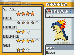 Nous sommes accueilli par Alcide, le propriétaire. Il nous explique que dans le Dôme PokéAthlon, nos Pokémon vont pouvoir participer à une dizaine d'épreuves différentes, s'affrontant grâces à cinq Performances notés dans les résumés de nos Pokémon par des étoiles (figure 78). Ces épreuves se présentent sous la forme de mini-jeux joués au stylet sur l'écran tactile de la DS.